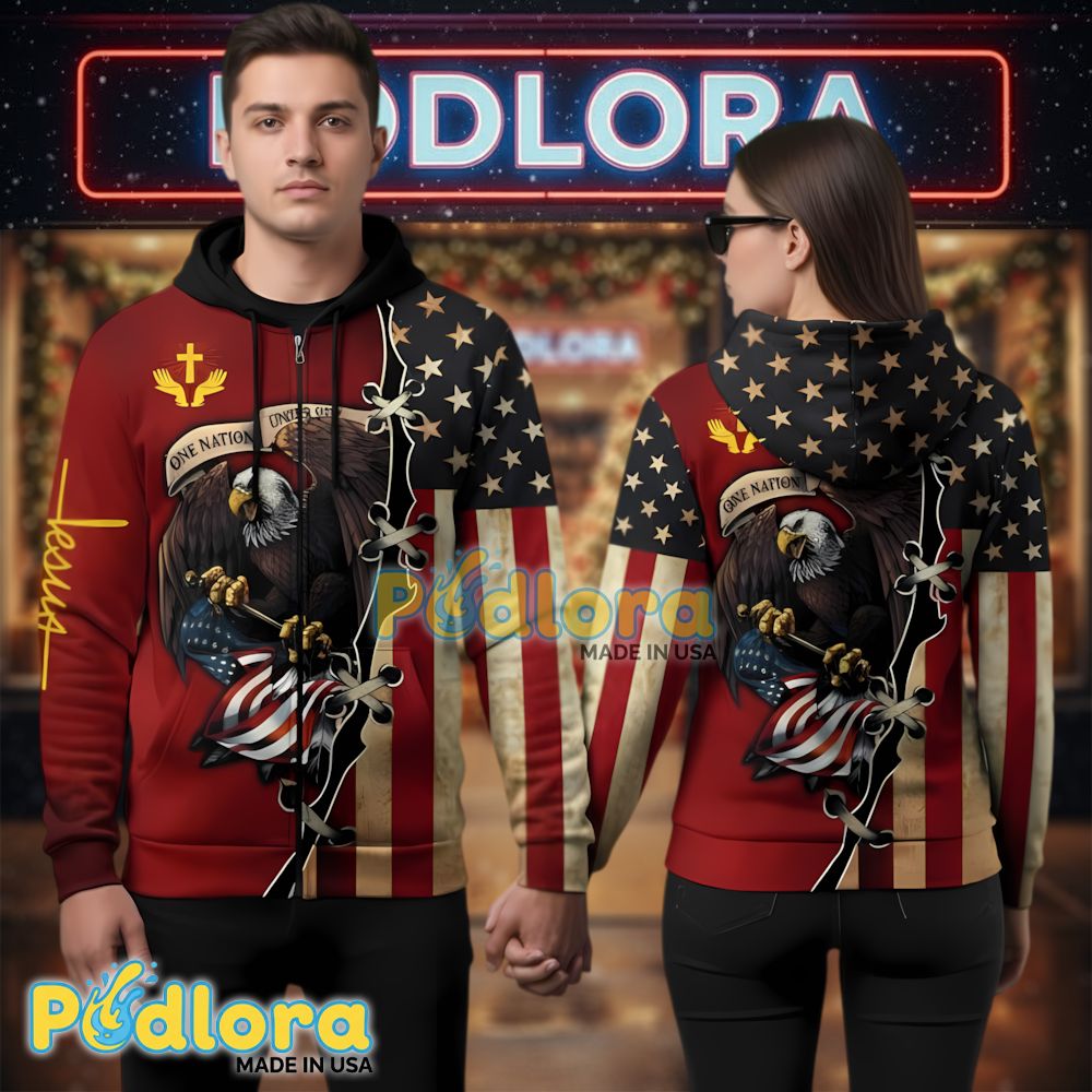 Veteran Jesus Hoodie 3D Full Zip Eagle American Flag One Nation unites faith and patriotism through powerful military imagery. Podlora’s all-over print zip-up hoodie features majestic eagle clutching American flag alongside white faith cross with “ONE NATION UNDER GOD” banner, “Jesus” text on sleeve, and religious symbols on burgundy-and-stars background, creating the ultimate spiritual warrior tribute for veterans who served with faith guiding their courage and sacrifice.
